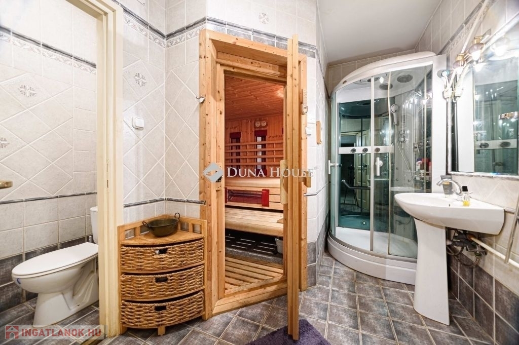 Az alsó szint valódi különlegesség: wellness részleg fin- és infraszaunával, zene szoba, mosókonyha, valamint további kiszolgáló helyiségek szolgálják a kényelmet és a kikapcsolódást. A három szinten végig gondosan megtervezett tárolók és gardróbok diszkréten simulnak bele az enteriőrbe.