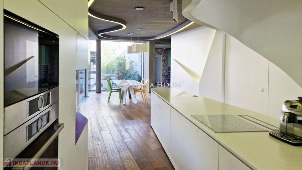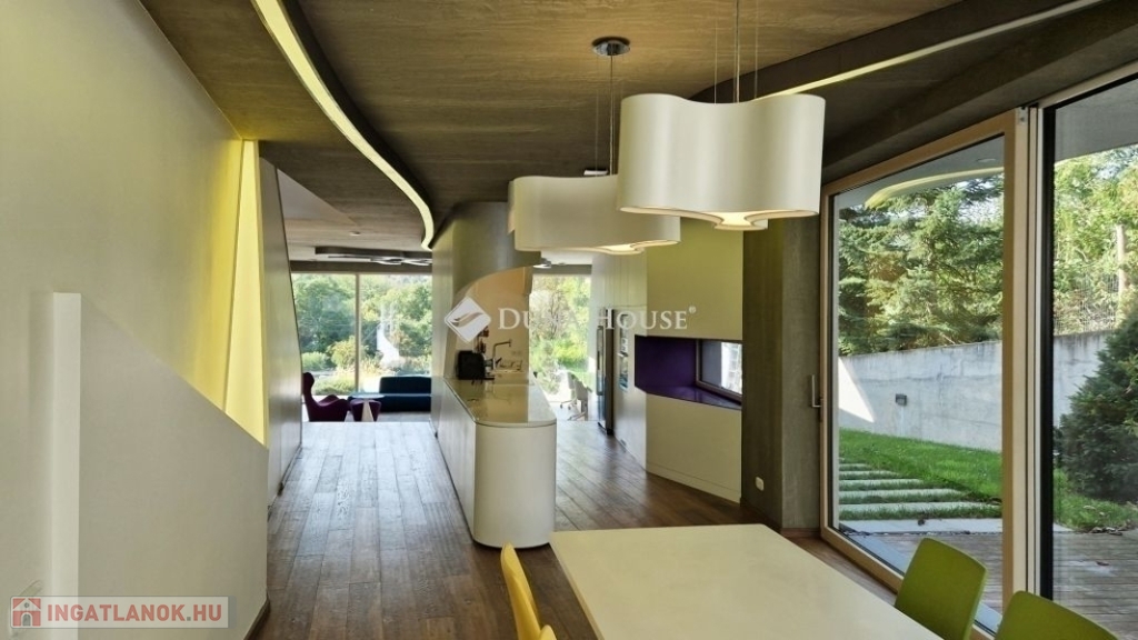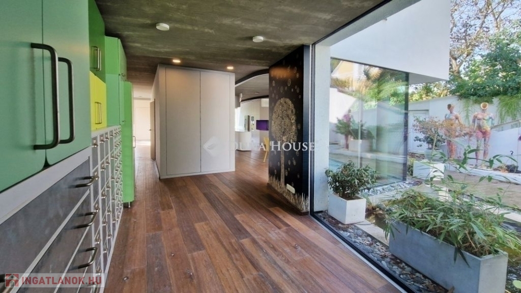 A földszinti 40 m2-es napsütötte, déli tájolású nappaliból tudunk kilépni a medencés teraszra. Az öntözőrendszerrel felszerelt, gyönyörűen parkosított kert igazi megnyugvást ad egy sűrű nap után. A házhoz tartozik kerti konyha, jacuzzi és saját fitness terem is.