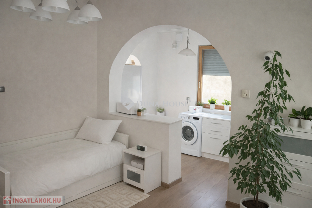 A másik házrészben egy kimondottan tágas étkezős-konyhát, nappalit, modern fürdő-wc-t és egy tárolót alakítottak ki. A lépcső egy szintén nagy méretű szobába vezet fel, ahonnan a 27nm-es teraszra léphetünk ki.