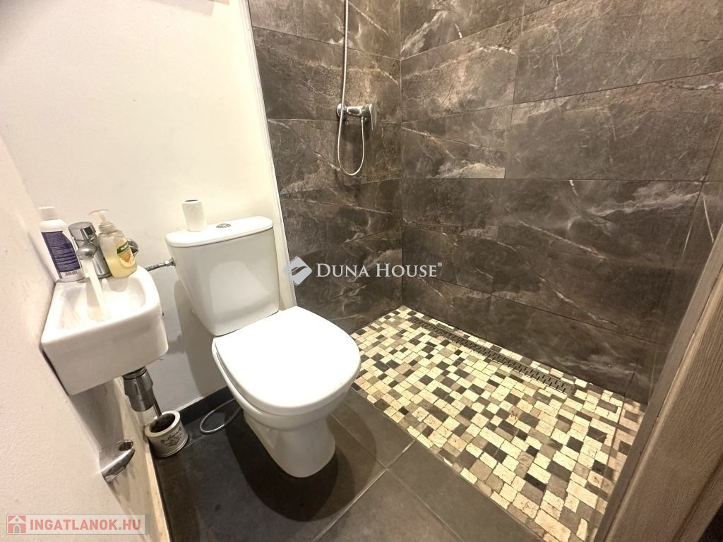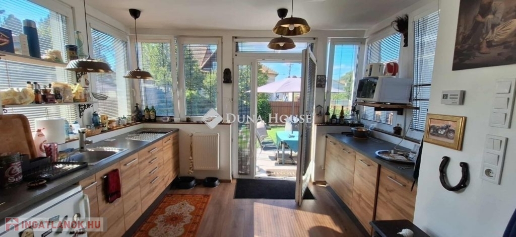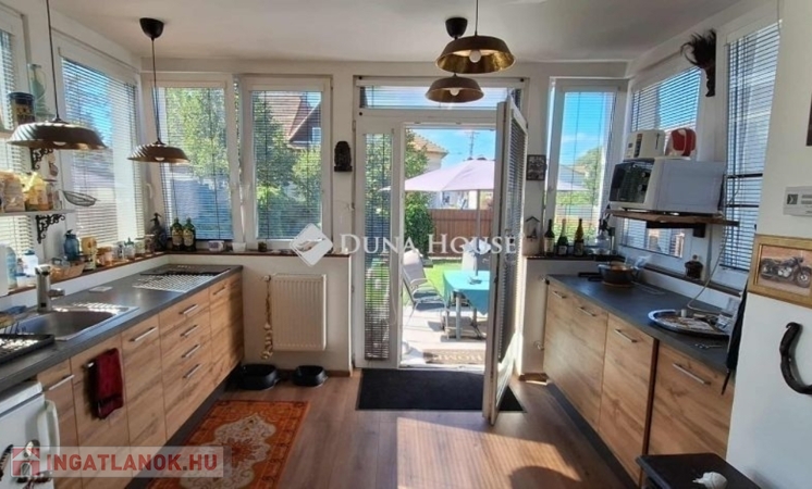 Az ingatlanba a kertből belépve egy tágas, napos nappaliba érkezünk egy étkezős konyhán keresztül, mely egy térben van a nappalival. Kialakításra került egy vendég fürdőszoba ezen a szinten.
