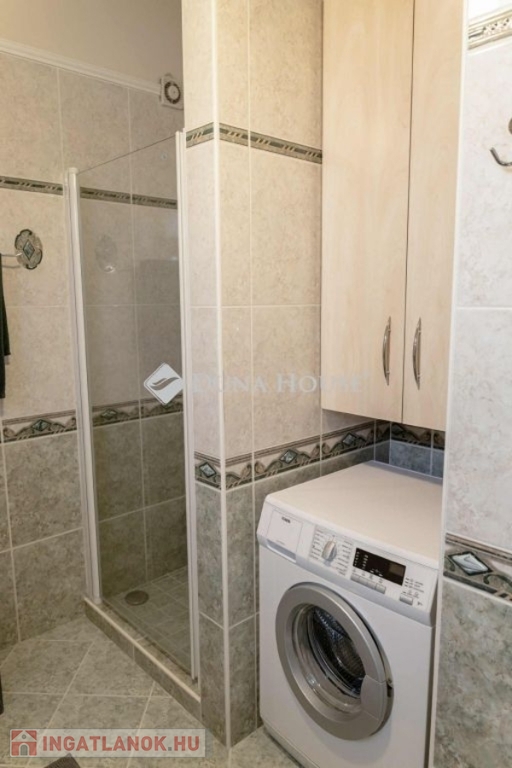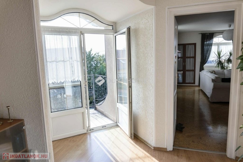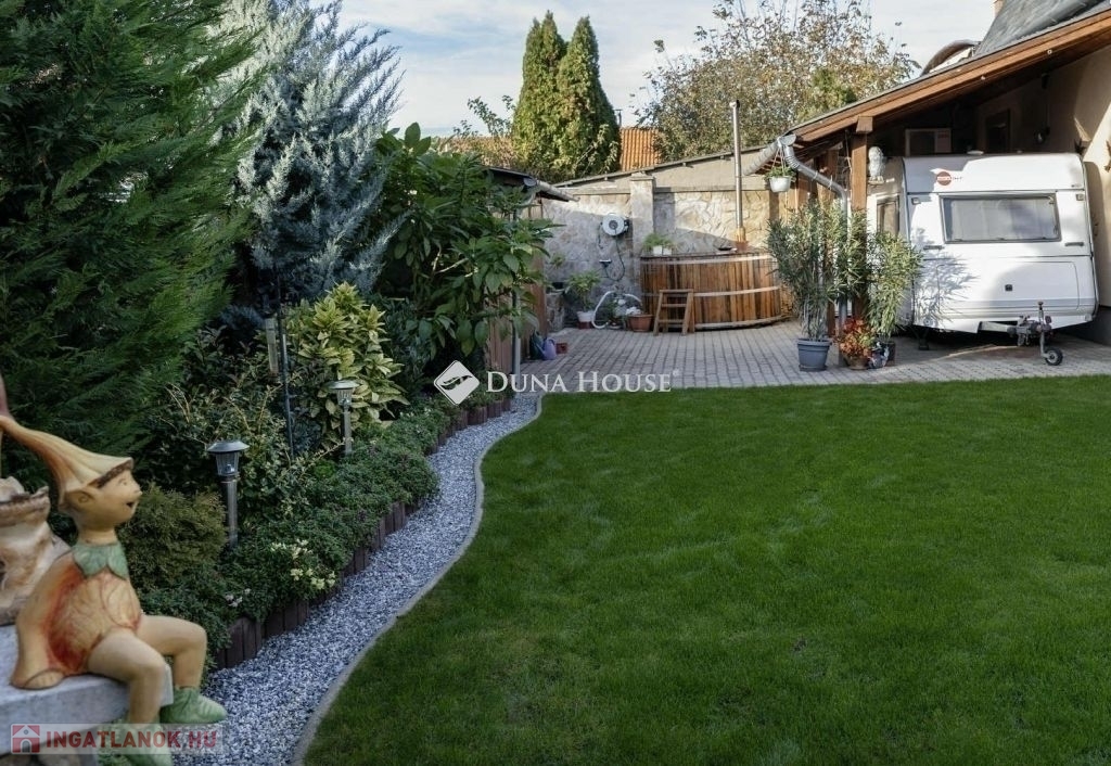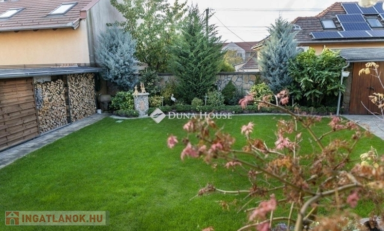 A nappaliban beépített gyönyörü cserépkályha mellett élvezhetjük a téli estéket. A konyha beépített, gépesített konyhabútorral. A földszinti hálószobából gardróbszoba és fürdőszoba nyílik. A ház alatt a földszintről megközelíthető 12 nm-es pince található. A házból nyílik az egy kocsi beállós garázs. A kertben fedett kocsibeálló is található, ami az elektromos kapun keresztül közelíthető meg. Az emeleten két szoba, beépített gardróbszekrényekkel, nappali és fürdőszoba található. A kert gondozott, ápolt pázsittal, nővényekkel, grill sarokkal és dézsafürdővel, valamint háromrészes tárolóval, a bejárat előtt hangulatos, fedett nagy terasszal.