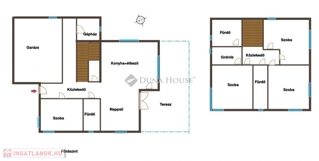 Alsó szinten 2 állásos garázs, amerikai konyhás nappali , háló, fürdő, tároló, valamint háztartási helyiség kapott helyet, az emeleten pedig 3 hálószoba, 2 fürdőszoba, 2 gardrób lett kialakítva.