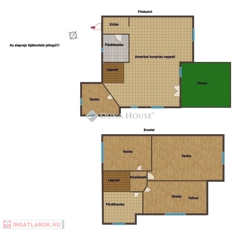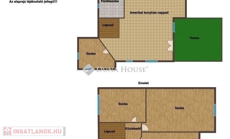 Az Élettérről: a földszinten, tágas-világos amerikai konyhás nappali (34m2), szoba, fürdőszoba és egy előszoba található. Az emeleten 3 szoba, közlekedő és egy fürdőszoba került kialakításra. A padlástér nem került beépítésre, kiválóan alkalmas elapakolandó dolgainkat elhelyezni. A nappaliból nyílik egy 14m2-es fedett terasz az udvari részre.