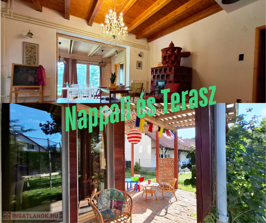 A földszinten egy tágas, világos nappali fogadja, ahol az egyedi cserépkályha melege igazi otthonos légkört teremt. A nappalihoz és a közösségi terekhez teraszok kapcsolódnak, melyek ideális helyszínei lehetnek a reggeli kávézásnak, a nyugodt pihenésnek vagy a baráti összejöveteleknek.