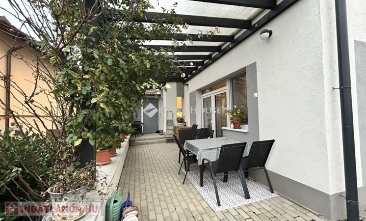 A gondosan karbantartott, szépen gondozott kert ideális helyszíne a kikapcsolódásnak, amelyhez egy nagy, fedett terasz is kapcsolódik tökéletes családi vagy baráti összejövetelekhez. A terasz mellett elhelyezkedő kerti tároló tovább növeli az ingatlan praktikumát.