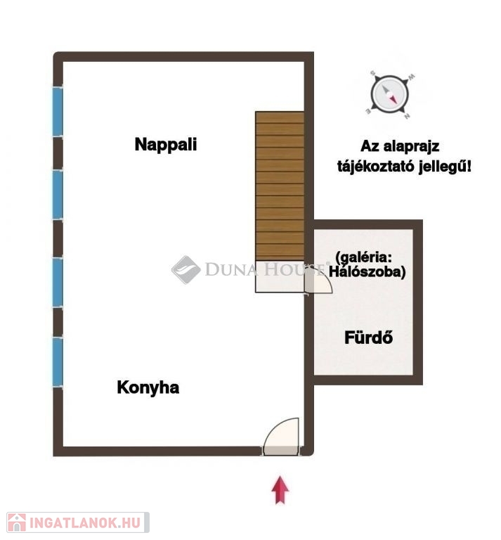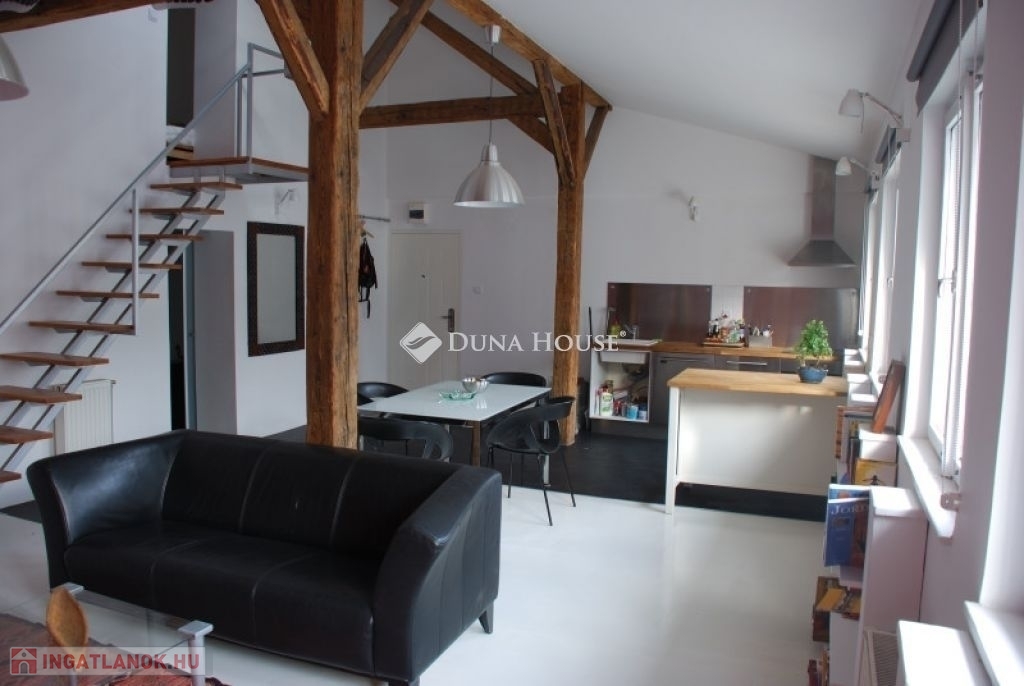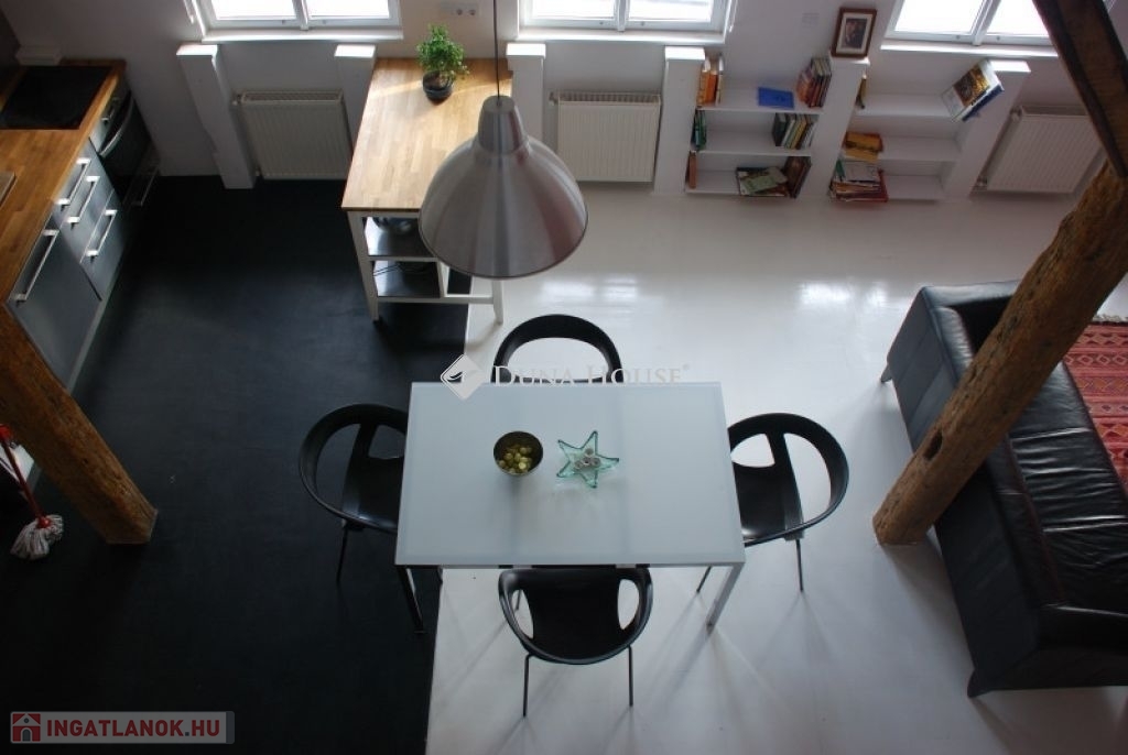 A lakás két szinten összesen 56 négyzetméter: míg az étkezővel és konyhával egybenyitott nappali tágas életteret biztosít, addig a felső szinten található beépített gardróbszekrényekkel és franciaággyal felszerelt hálóhelyiség teljesen privát marad. A belmagasság meghaladja az 5 métert is. A lakás felújítása során megőrizték az eredeti, csaknem 150 éves gerendákat, amik így teljesen egyedi hangulatot kölcsönöznek a tágas szobának. A nappali ablakai a ház belső udvarára néznek, valamint annak is köszönhetően, hogy az ingatlannak nincsenek felső szomszédai, a lakás a tér forgalma ellenére is csendes lakóhely.
