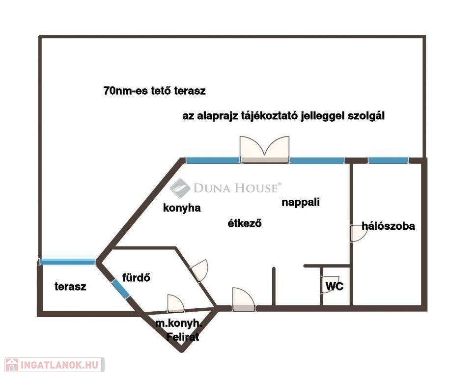 Alapterület: 50 nm lakótér + 70 nm saját tetőterasz