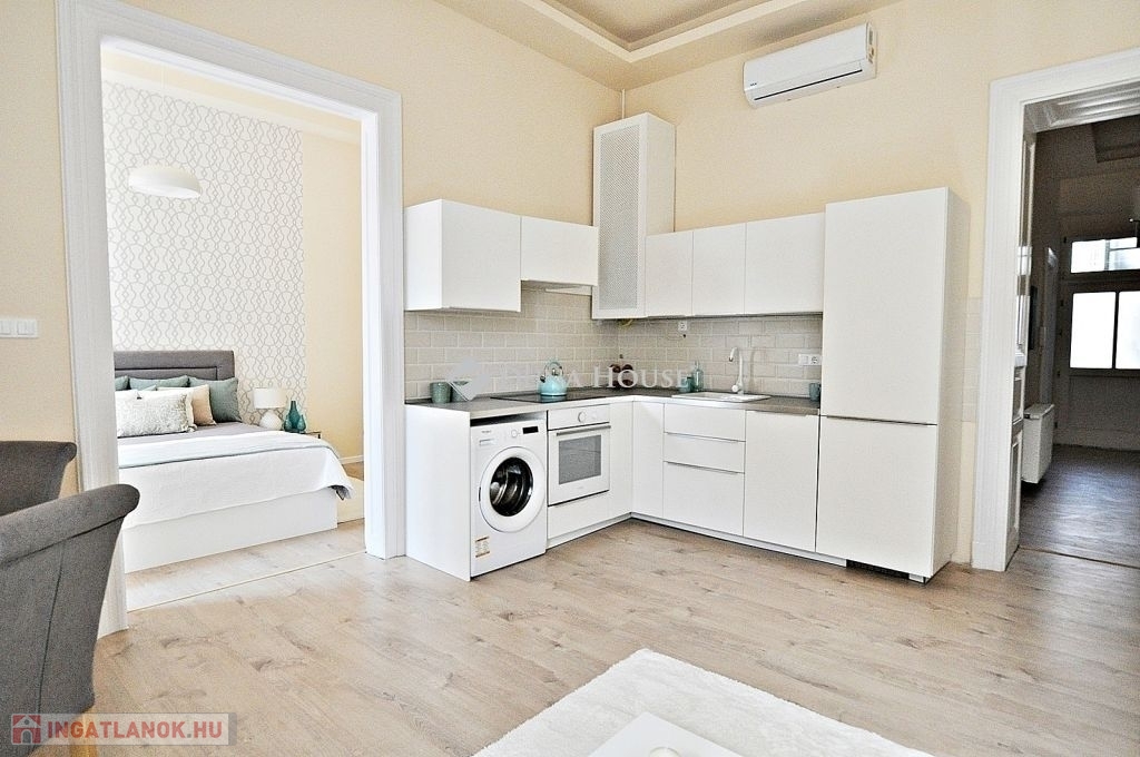 Eladó stílusos, felújított nagypolgári lakás a Rottenbiller utcában-A belvárosi elegancia találkozása a modern kényelemmelEladásra kínálunk Budapest VII. kerületének egyik legpatinásabb utcájában, a Rottenbiller utcában egy igényesen felújított, nagypolgári jellegű, 2 és fél szobás lakást. Az ingatlan egy rendezett, klasszikus polgári társasházban található, amelynek elhelyezkedése ideális mind lakhatási, mind befektetési célokra.A lakás egyik legnagyobb értéke a nagy belmagasság és a kiváló térérzet, amelyet a tágas, világos helyiségek tovább erősítenek. A teljes körű felújítás során a klasszikus stílusjegyek megtartása mellett modern megoldások kerültek beépítésre, így az ingatlan egyszerre nyújt időtálló eleganciát és korszerű kényelmet. A fűtést kondenzációs kazán biztosítja, emellett hűtő-fűtő klíma is rendelkezésre áll, ami egész évben komfortossá teszi a lakást.Jelenleg rövid távú kiadásként, Airbnb-ként működik, így azonnali bevételt termelő befektetésként is megvásárolható. A társasház engedélyezi a rövid távú bérbeadást, ami különösen értékes szempont a belvárosi ingatlanok piacán.A Rottenbiller utca elhelyezkedése kiváló: néhány perc sétára található a Keleti pályaudvar, a Blaha Lujza tér, a Városliget, valamint számos egyetem, kávézó, étterem és üzlet. A környék infrastruktúrája fejlett, tömegközlekedéssel könnyedén elérhető a város bármely pontja.Ez az ingatlan tökéletes választás lehet azok számára, akik belvárosi, mégis nyugodt környezetben keresnek minőségi otthont, vagy olyan befektetési lehetőséget, amely azonnal hasznot termel. A lakás tehermentes, rugalmasan megtekinthető, és akár azonnal birtokba is vehető.