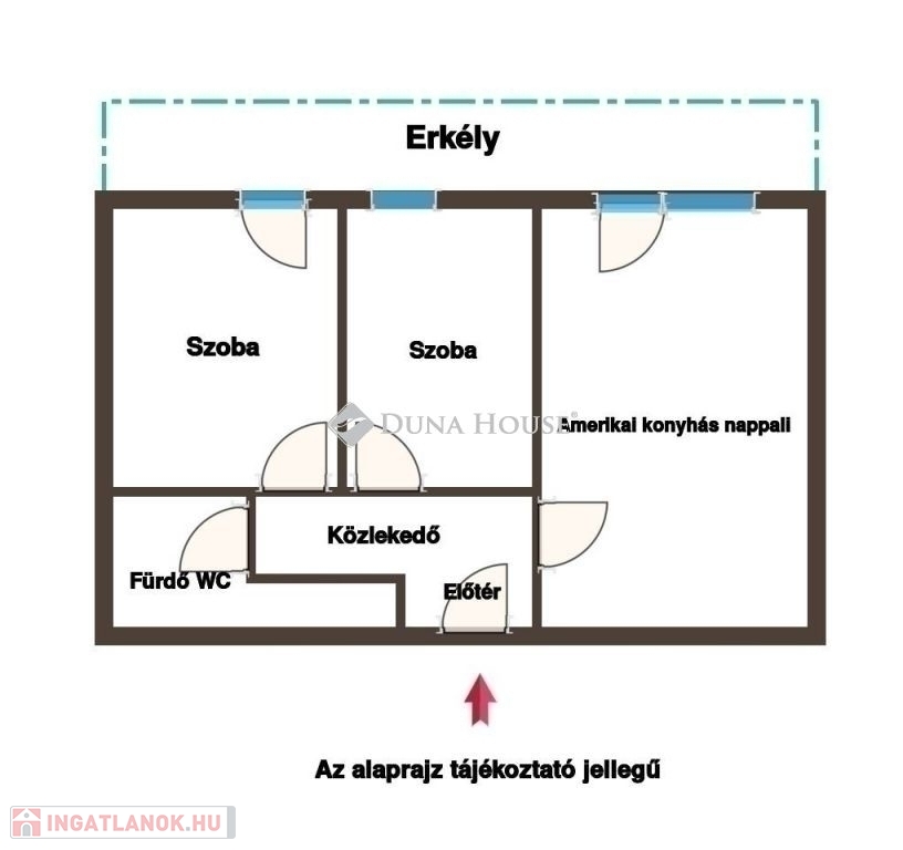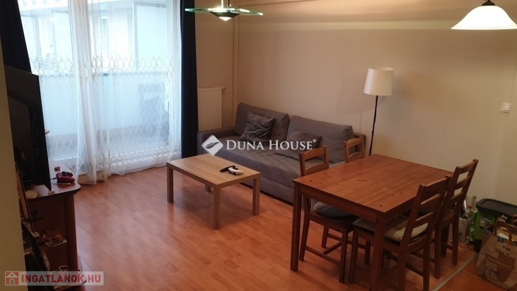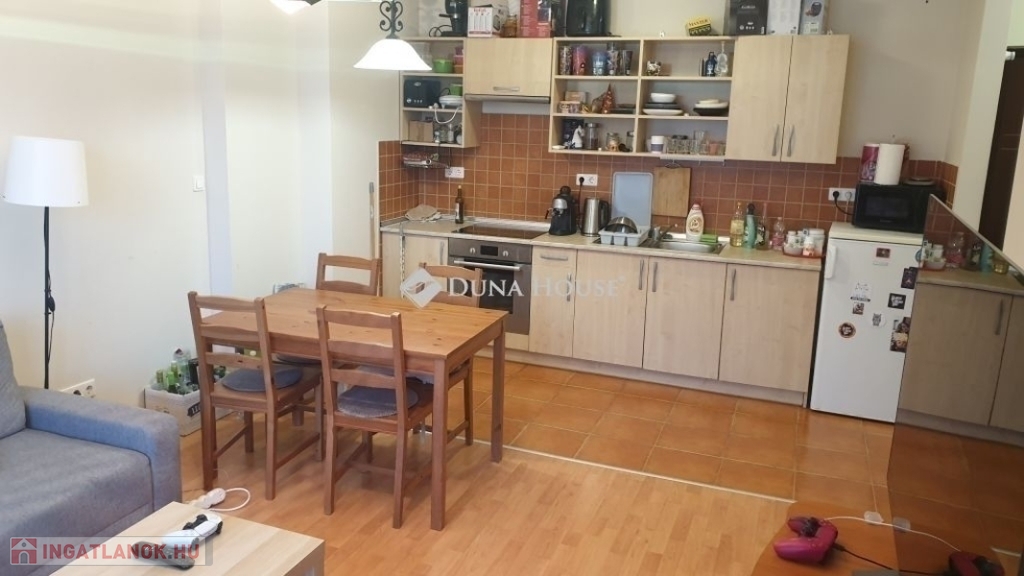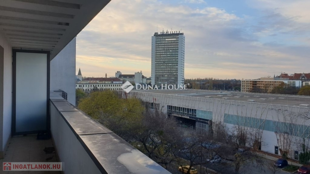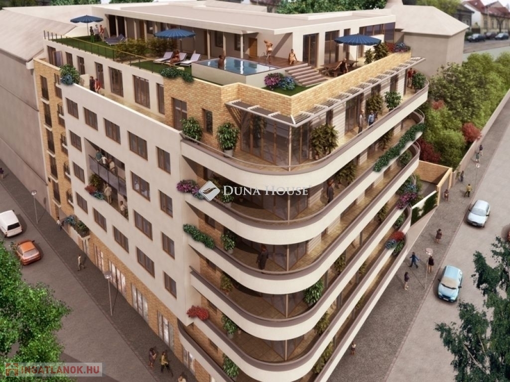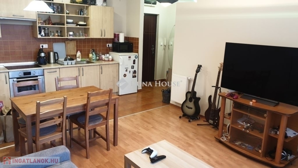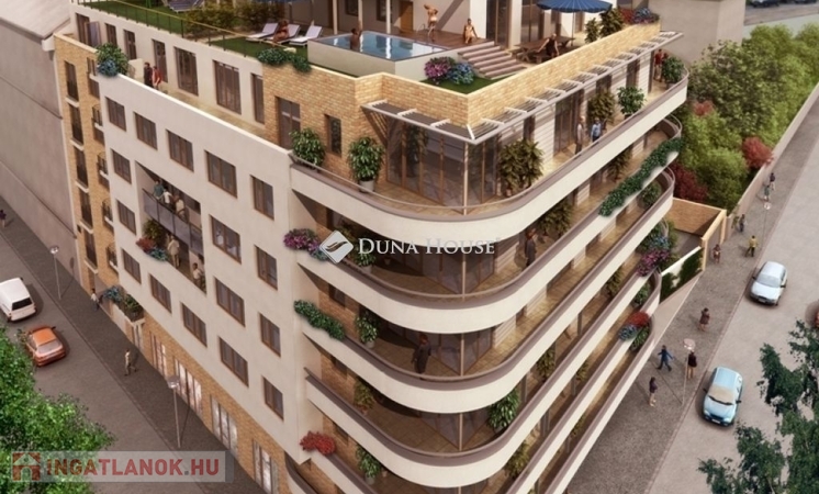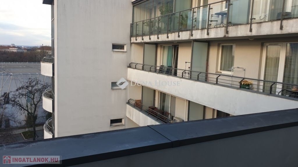 A 104 lakásos lakóparkban gondozott belső kert,és 24 órás házfelügyelet is van. A hét emeletes lakópark alsó szintjén üzletek és kényelmi szolgáltatások vehetők igénybe. A hatodik emeleten lévő lakás 47, 90 m2 nettó alapterületű+9,84 m2 erkély tartozik hozzá. A lakótérben amerikai konyhás nappali, két hálószoba, előtér,kádas fürdőszoba, közlekedő van.