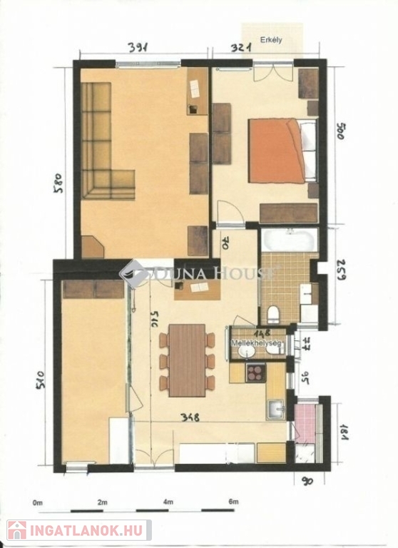 A hálószobák külön bejáratúak, biztosítva a privát tér érzetét. A konyha praktikus elrendezése minden igényt kielégít.