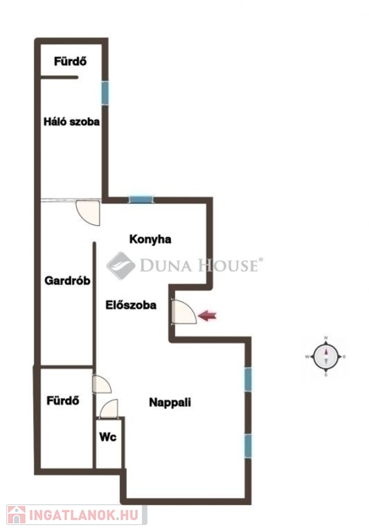Az ingatlanba besétálva egy nagy loftszerű térben találja magát az ember, ami különleges egy 54nm-es lakásnál. Ez magában foglalja a konyhát, előszobát, gardróbszobát és nappalit. A térnek a nappali részéből (balra) nyílik az egyik fürdőszoba és a külön WC is. A konyha részéből (jobbra) nyílik a gardróbszoba és hálószoba külön fürdőszobával.