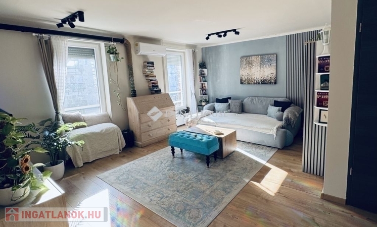 Hűtő-fűtő klíma, okosbojler, majdnem földig érő szúnyoghálós, redőnyös ablakok.