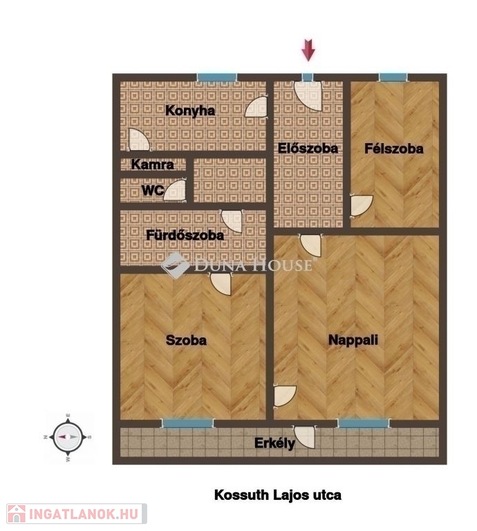 A 68 m² jól használható tér klasszikus, élhető elrendezés, 3 különnyíló szoba, Loggia + külön erkély , ház tégla építésű.