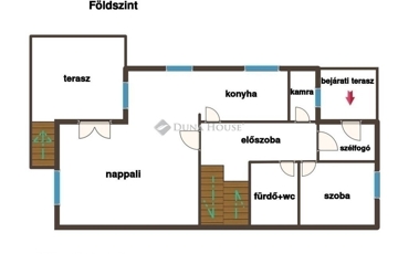 A földszinten a nagy méretű nappali és szintén tágas konyha, egy hálószoba és egy fürdőszoba kapott helyet, illetve a nappaliból kilépve itt található a hangulatos, fedett terasz, melyről közvetlen lejárat van a lakópark kertjébe.