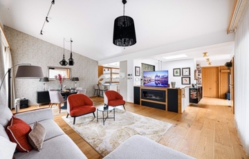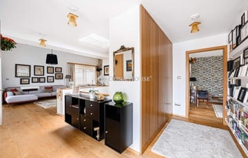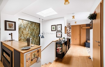 tágas, 3,15 m belmagasságú nappaliétkező, közvetlen teraszkapcsolattal; modern konyha kamrával; hálószoba; fürdőszoba; külön WC; gardrób/dolgozó és elegáns belső lépcső .